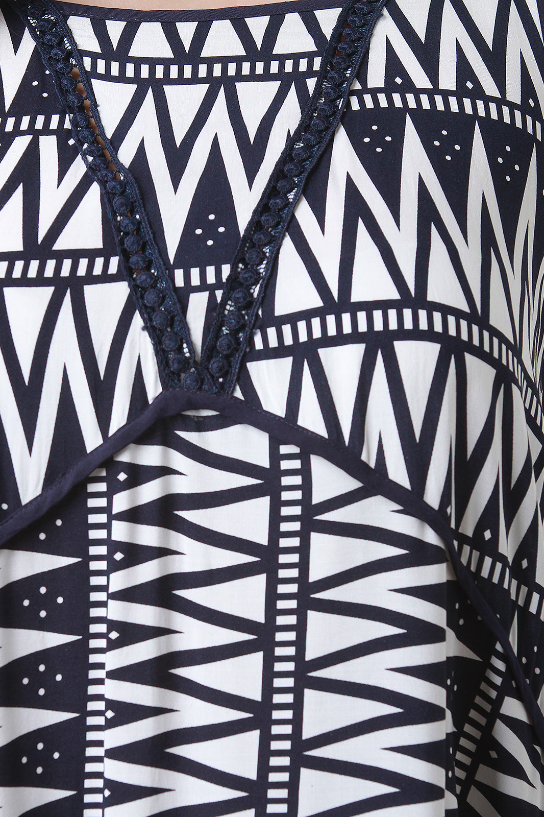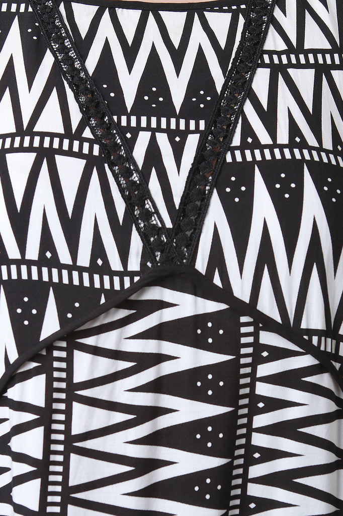 This plus size dress features a woven knit fabrication, abstract zigzag print, crochet and piping details, and sleeveless fit. Finished with a contrasting high-low hemline. Accessories sold separately. 100% Rayon.
