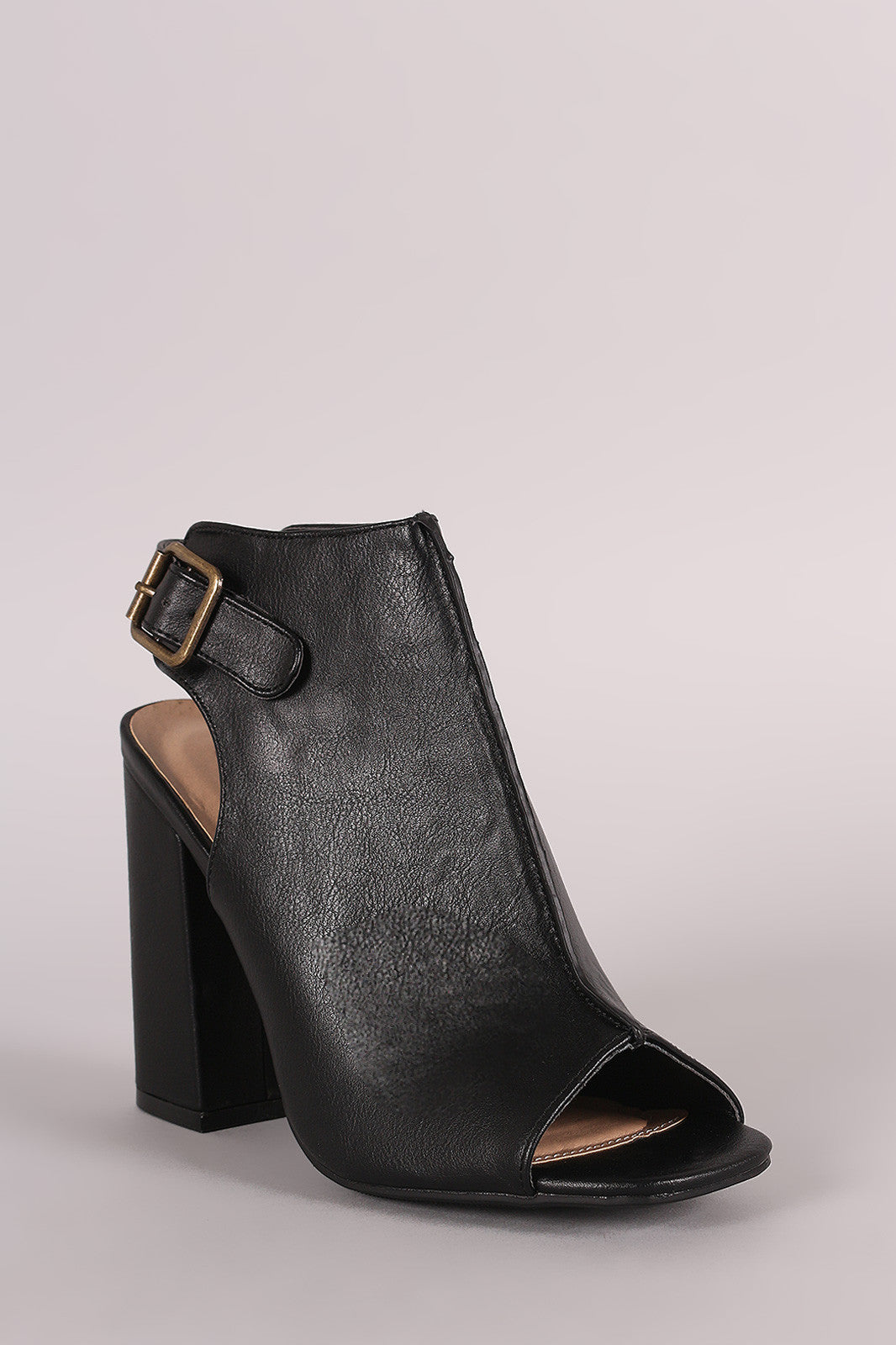 These booties feature a peep toe silhouette, vertical seam from top of the vamp to toe, back cutout detail, and chunky wrapped heel. Finished with cushioned insole and adjustable slingback strap with buckle closure.