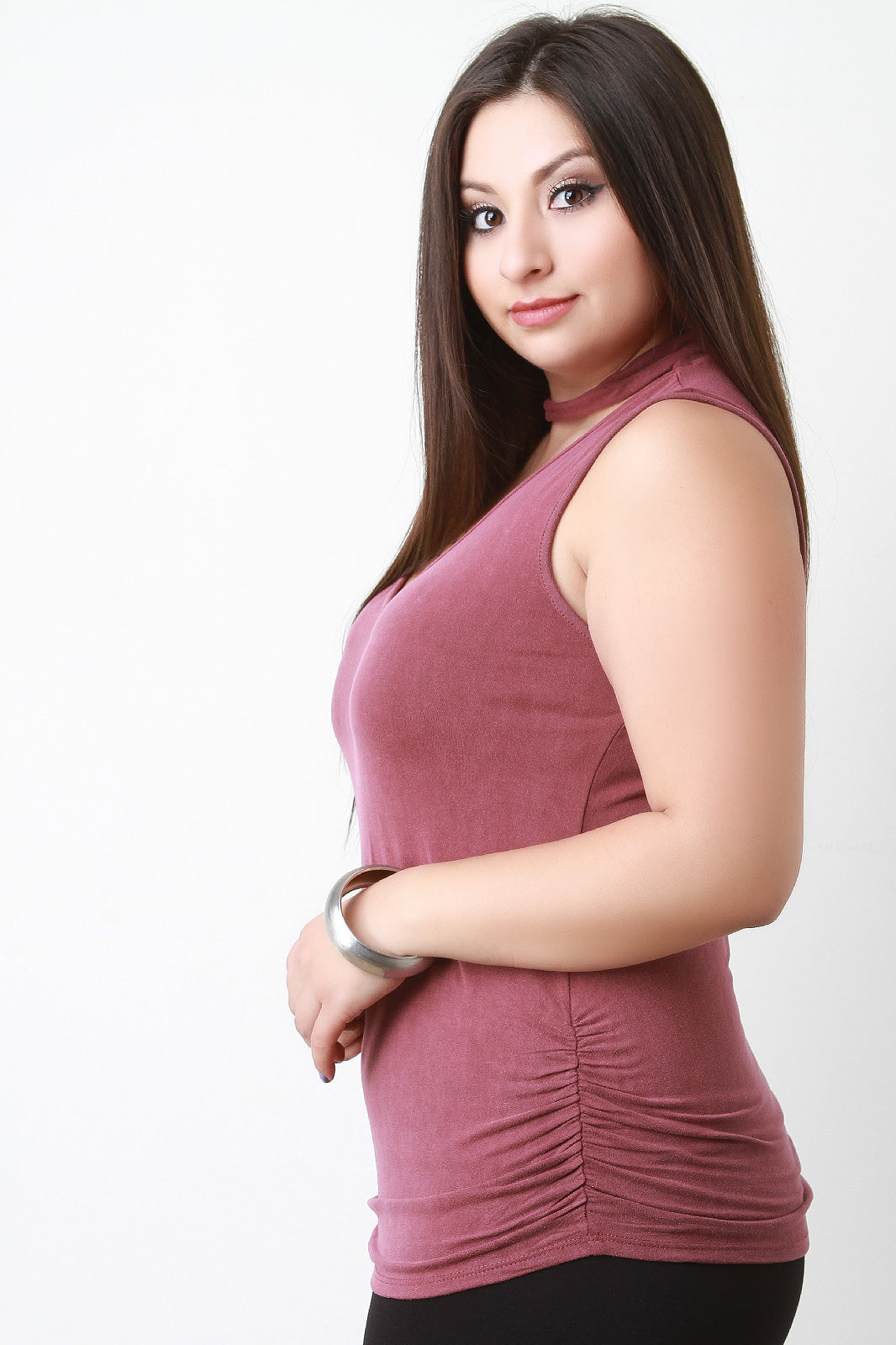 This plus size top features a smooth stretchy knit fabric, choker band with front keyhole cutout, sleeveless design, and side ruched detail. Accessories sold separately. Made in U.S.A. 97% Rayon, 3% Spandex.