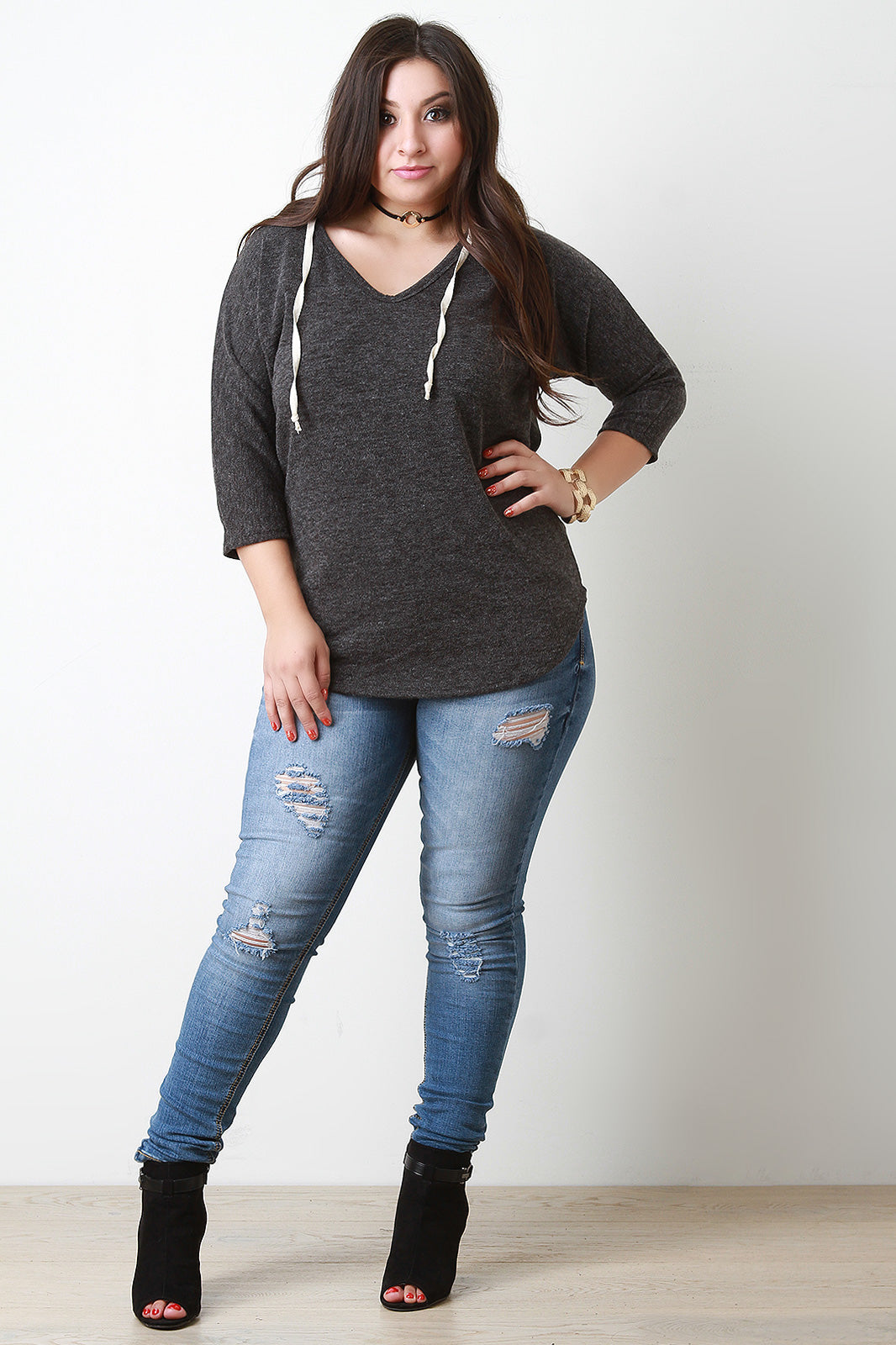 This plus size sweater features a knitted fabrication, v neckline, hood, faux drawstring, dolman half sleeves, relaxed fit and a rounded hemline. Accessories sold separately. 95% Polyester 5% Spandex.