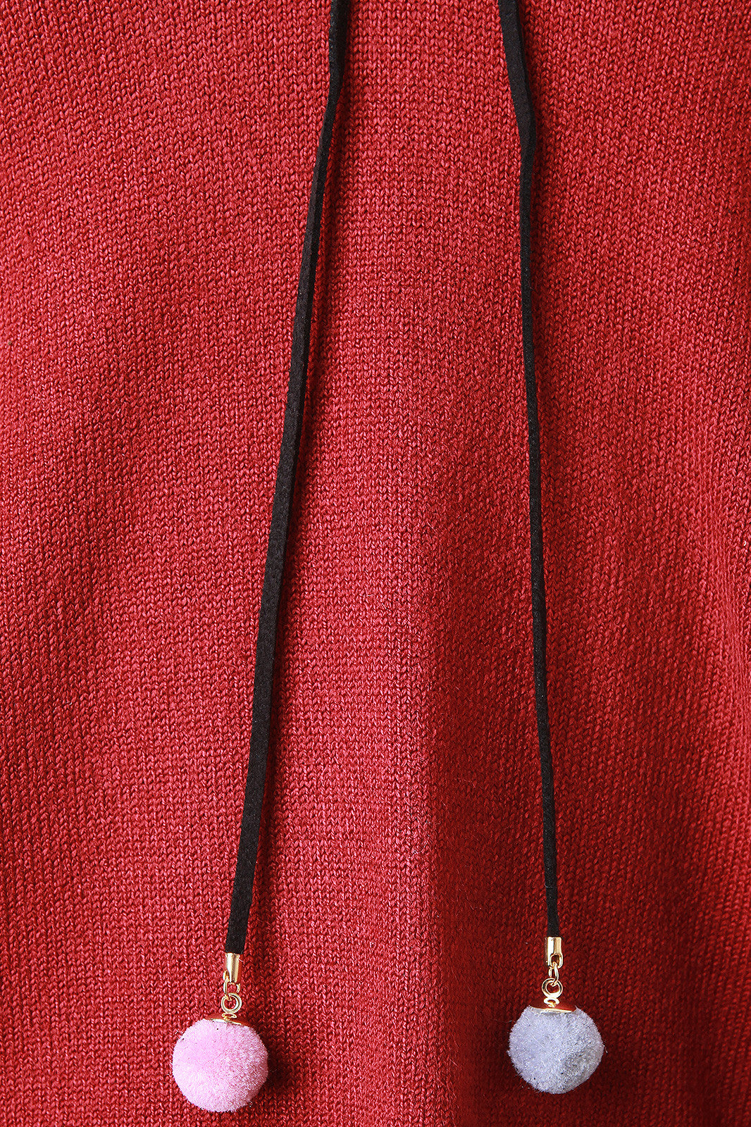 This features a vegan suede cord, double cord choker design with gem charm accent, long self-tie cord, pom pom aglets, and finished with an adjustable lobster hook closure.