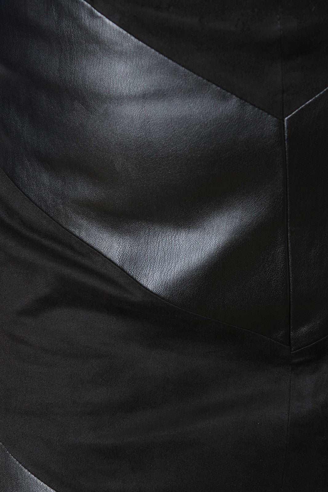 This chic plus size skirt features faux leather, faux suede, chevron pattern, back zipper closure, and mini length. Accessories sold separately. Self: 55% Polyester, 45% Polyurethane. Contrast: 91% Polyester, 9% Spandex.