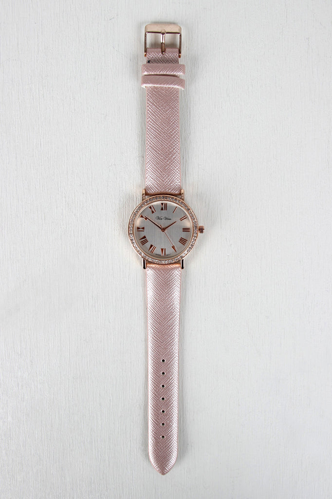 This watch features a vegan leather band, shimmer finish, cross hatch embossed detail, brushed metallic face, roman numerals, and rhinestones set in rim. Finished with an adjustable buckle closure.