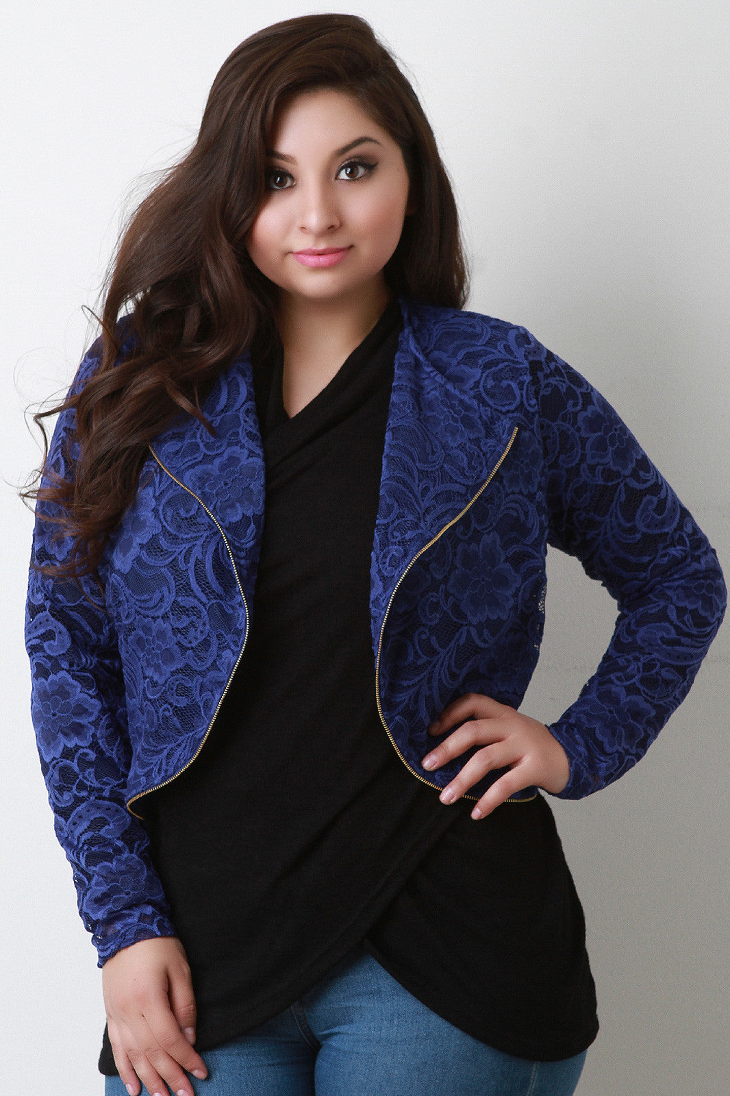 This elegant plus size bolero features a beautiful floral lace fabrication, long sleeves design, decorative zipper trim, and open front style. Accessories sold separately. Made in U.S.A. Self: 90% Nylon, 10% Spandex. Lining: 100% Polyester.