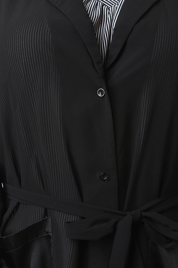 This plus size maxi top features a semi-sheer chiffon fabric, contrast front silk pockets, and self-tie sash on waist and long sleeves. Button-up closure, notched collars, and side slits finish. Accessories sold separately. 100% Polyester.