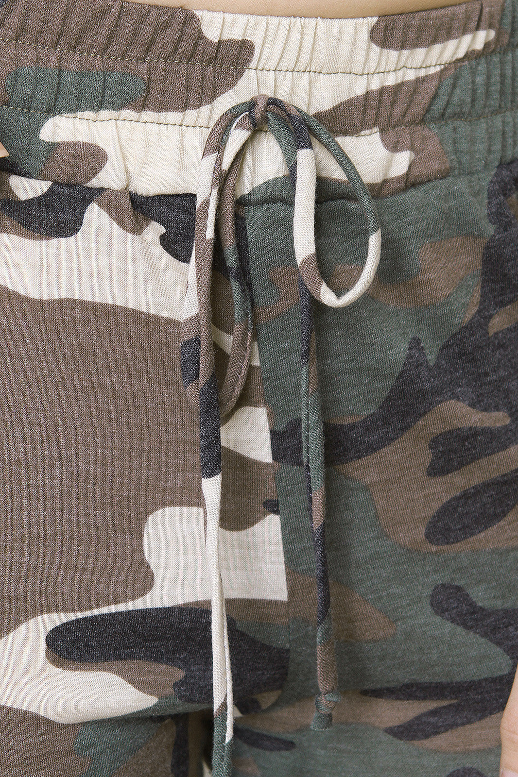 These jogger pants feature a jersey knit fabric, elasticized waist with faux drawstring, camouflage pattern throughout, and cuffed hemline. Accessories sold separately. 95% Rayon, 5% Spandex.