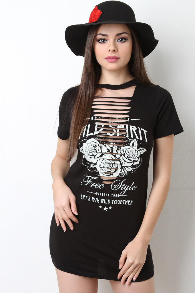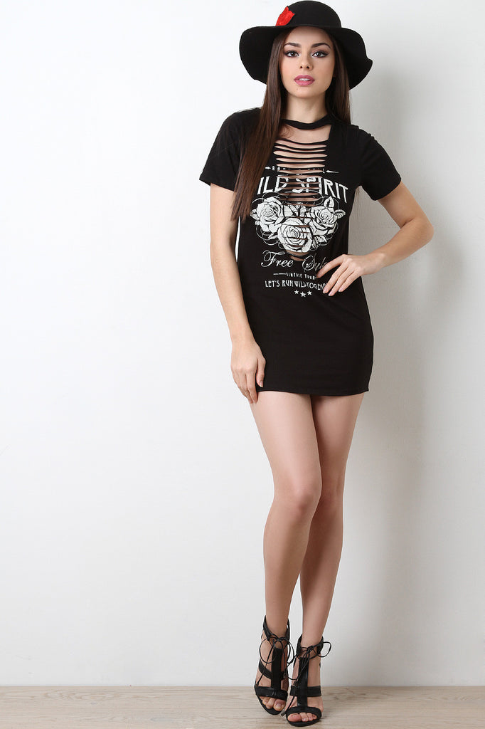 This t-shirt dress features a crew neckline, slash yoke design, short sleeves, and Wild Spirit screen print at front. Accessory sold separately. Made in U.S.A. 95% Cotton, 5% Spandex.
