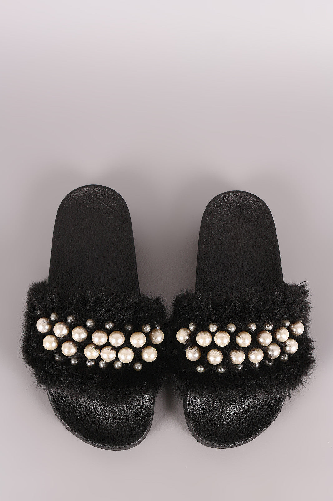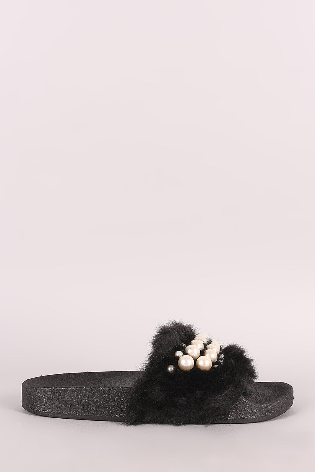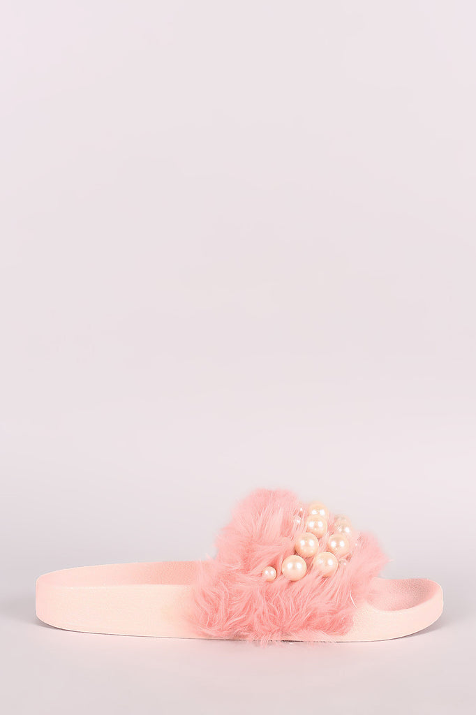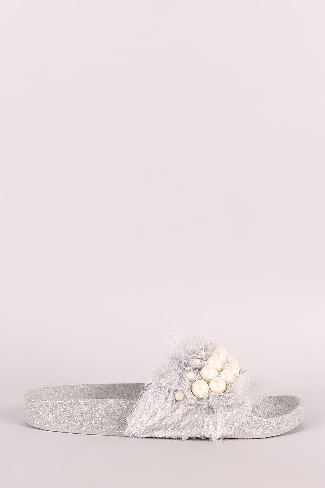 This fluffy slide sandal features a soft faux fur band with multi-size pearly beads accent and molded foodbed. Easy slip-on style.Material: Faux Fur (man-made)Sole: PVC